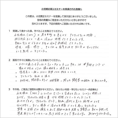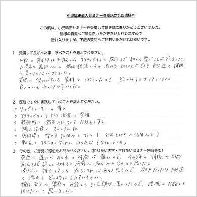 症例や動画、アクティビティプリントなど具体的な資料が豊富で、非常に分かりやすく実践的な研修でした。単なる知識のインプットではなく、「明日からどう動くか」まで考えられる内容だったことが印象に残っています。自院の課題を客観的に見直すきっかけにもなり、今後の方向性がより明確になりました。今後は、発達に課題のあるお子さまへの対応や、さらに実践的な臨床スキルについても学びを深めていきたいと感じています。